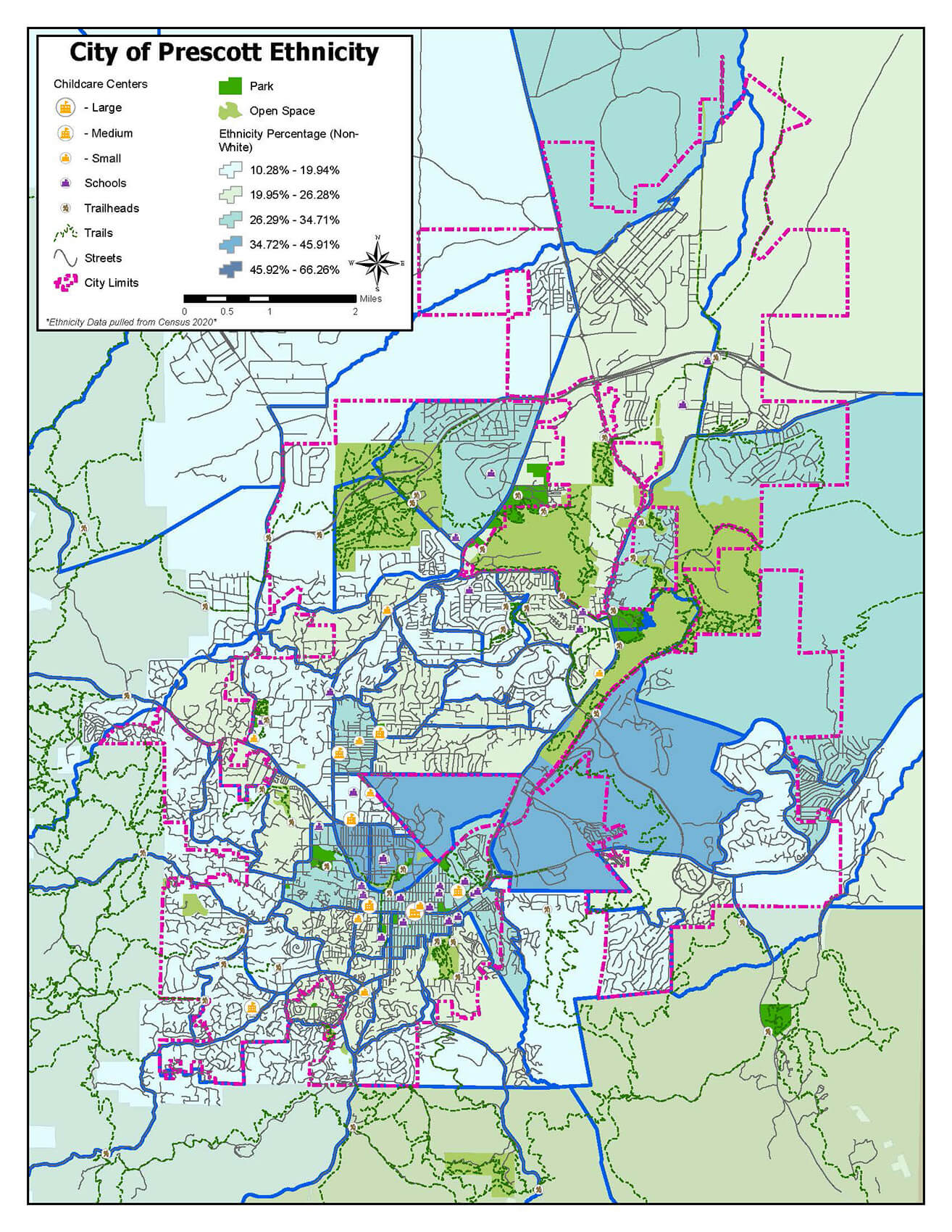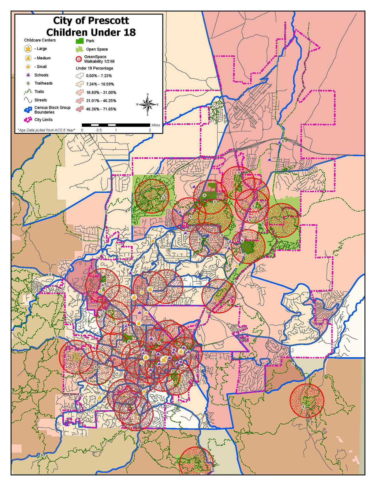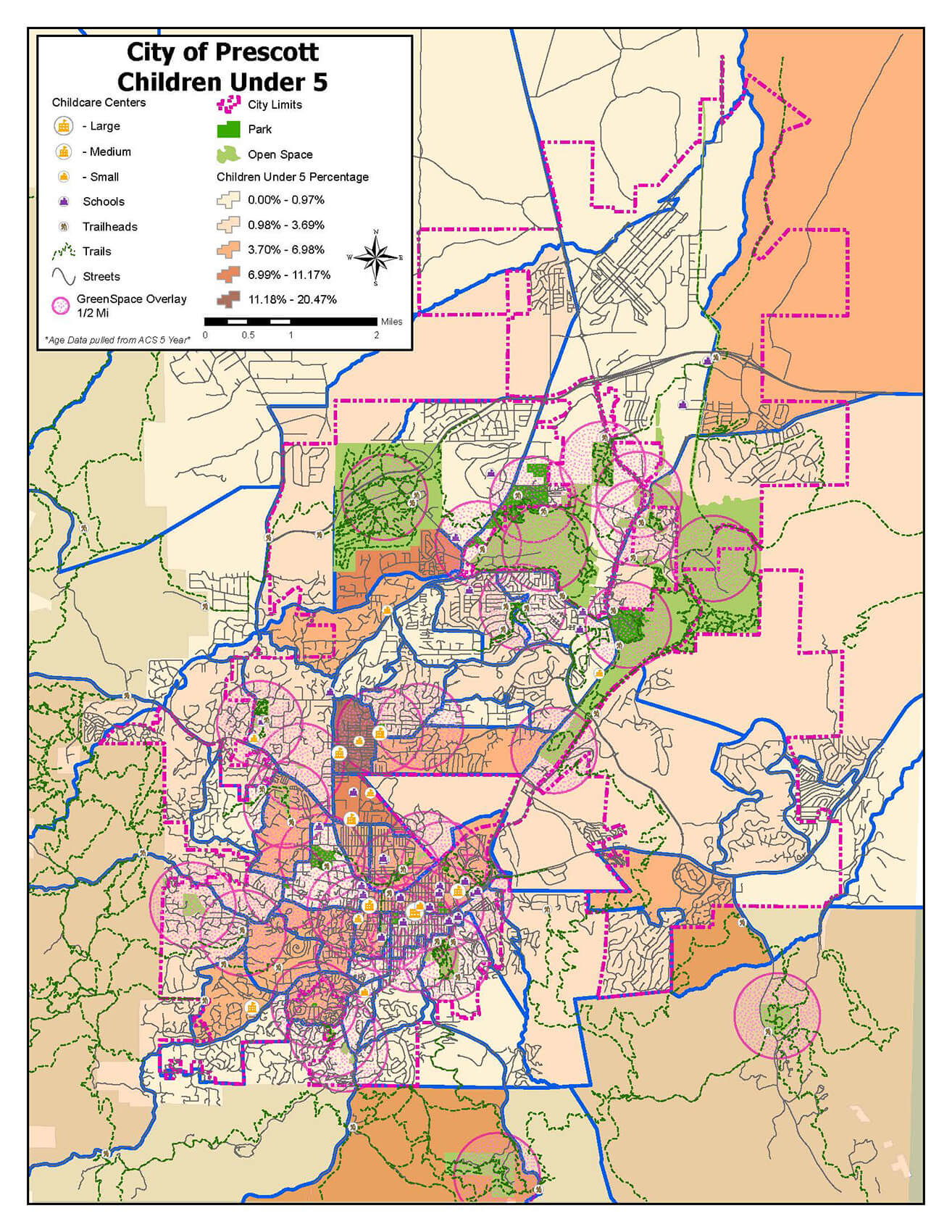 Goal of Mapping: The City of Prescott team compiled and mapped up-to-date data about young children and green space in order to identify needs and inequities across the city.